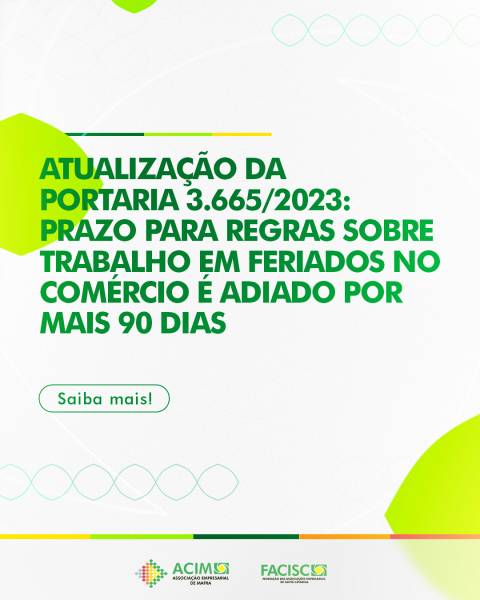 Compartilhamos a atualização sobre as regras de trabalho no comércio aos domingos e feriados, com base em análise realizada pelo jurídico da FACISC. A *Portaria nº 3.665/2023 que altera a regulamentação do trabalho em feriados, determinando que o funcionamento do comércio nesses dias depende de autorização em Convenção Coletiva de Trabalho (CCT), firmada entre sindicato patronal e laboral. Inicialmente a norma passaria a valer em março de 2026, porém o Governo Federal prorrogou novamente sua entrada em vigor por mais 90 dias, ampliando o prazo para que empresas e sindicatos se adaptem e negociem as condições de funcionamento.