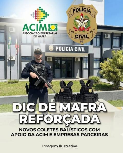A Delegacia de Investigação Criminal (DIC) de Mafra passou a contar, nesta semana, com um importante reforço na proteção de seus policiais civis: cinco coletes balísticos de alta tecnologia, conquistados por meio de uma ação conjunta entre a 9ª Delegacia Regional de Polícia, a Associação Empresarial de Mafra (ACIM) e empresas da cidade.